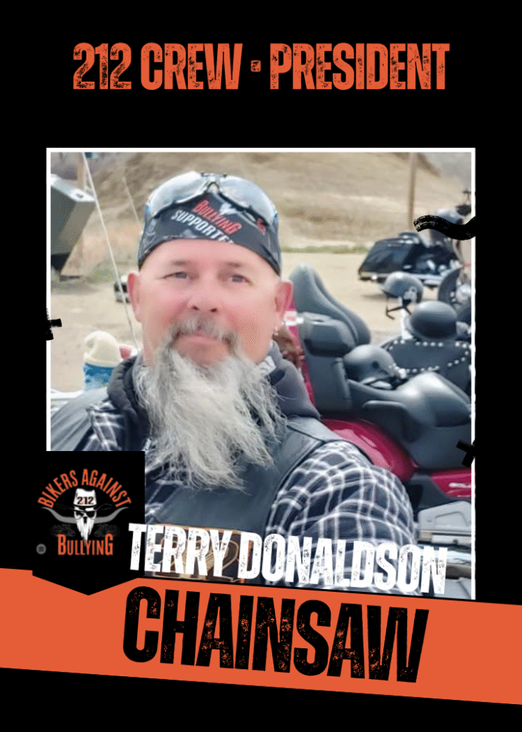 Terry “Chainsaw” Donaldson leads Chapter 3 with the kind of confidence that only comes from experience, grit, and a deep-rooted commitment to protecting others. As President, he sets the tone — strong, steady, and fiercely loyal to his riders and the families they serve.